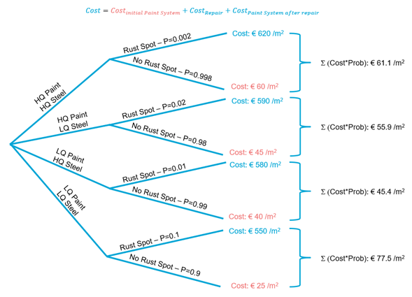 Common cost cutting measures are to use a cheaper paint that costs half as much, but is five times more likely to fail, or to simply sand the old paint rather than stripping it off prior to applying a new paint, which increases the failure probability by 10, but only costs €5 per square meter.
