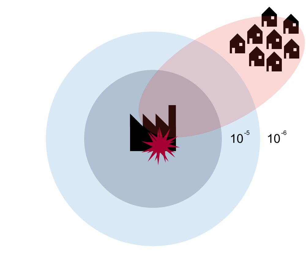 Fig. 32 Example of a schematic individual risk contour (circles) for a chemical installation.#